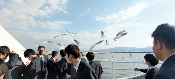 工業科はフェリーに乗って、カモメに餌やりをしました。