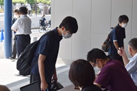 山梨県立青洲高等学校 > 学校生活 > 青洲DIARY > 時差登校前団 2020年6月8日カテゴリー: 青洲DIARY 学校生活 時差登校前団 今週から新型コロナウイルス対策の市川高校との時差登校が前団となり、一時間早い登校となりました。 生徒たちの様子は変わりなく、元気な挨拶が聞こえました。 今週も、登校前検温のClassiへの入力について、登校時のチェックを行っています。