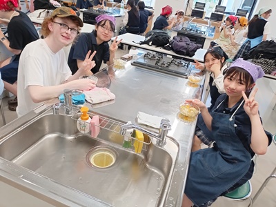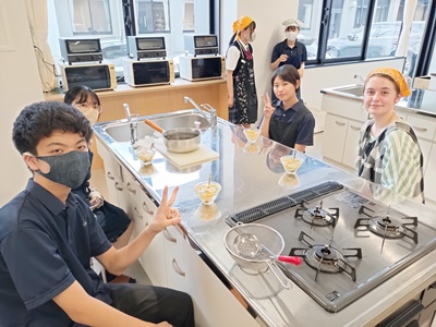 ESS部と家庭部のコラボ企画で留学生と一緒にデザートを作って一緒に食べました。