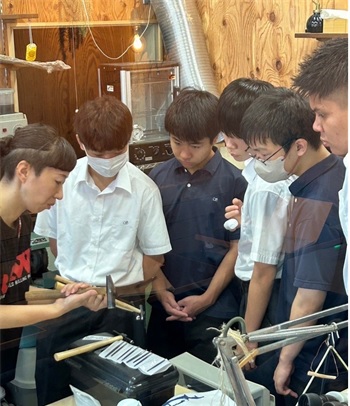 山梨県立青洲高等学校 > 教育活動 > 普通科 > 学科横断・課題研究「金属工芸」選択生徒 企業見学 2024年8月29日カテゴリー: 普通科 工業科 教育活動 学科横断・課題研究「金属工芸」選択生徒 企業見学 8月27日・28日に学科横断A「金属工芸」・機械工学科 課題研究「金属工芸」選択生徒が市川三郷町にある「ヨイアサー屋・工房たずわ」へ見学に行きました。 今回見学させて頂いたところは、工房兼ショップ・カフェを営んでいてアクセサリーの製作販売をしています。オーナーの村松祐子さんにお話しを聞き、商品を製作する上での注意やディスプレイや販売の仕方などを教えて頂きました。 学科横断A 金属工芸 機械工学科 課題研究 金属工芸
