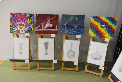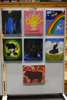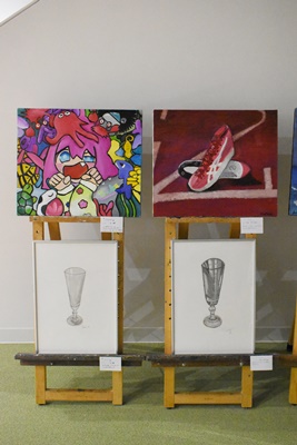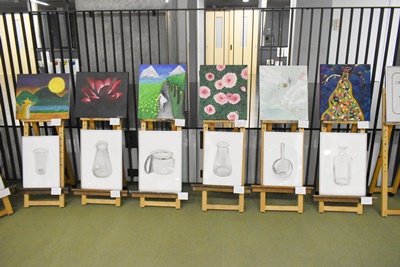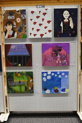 美術の1年1,2組および、2年次美術選択者の授業中に作成した課題の展示が行われています。