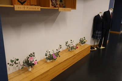 生徒用玄関に華道部の作品が展示されています。