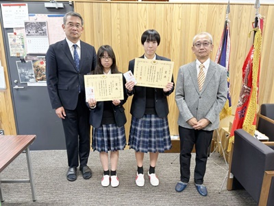 毎年夏休みの課題として応募している「税に関する高校生の作文コンクール」においいて、1年1組の窪田さんと1年1組の松村さんが鰍沢税務署長賞を受賞し、昨日、校長室において表彰式が行われましたので、報告します。