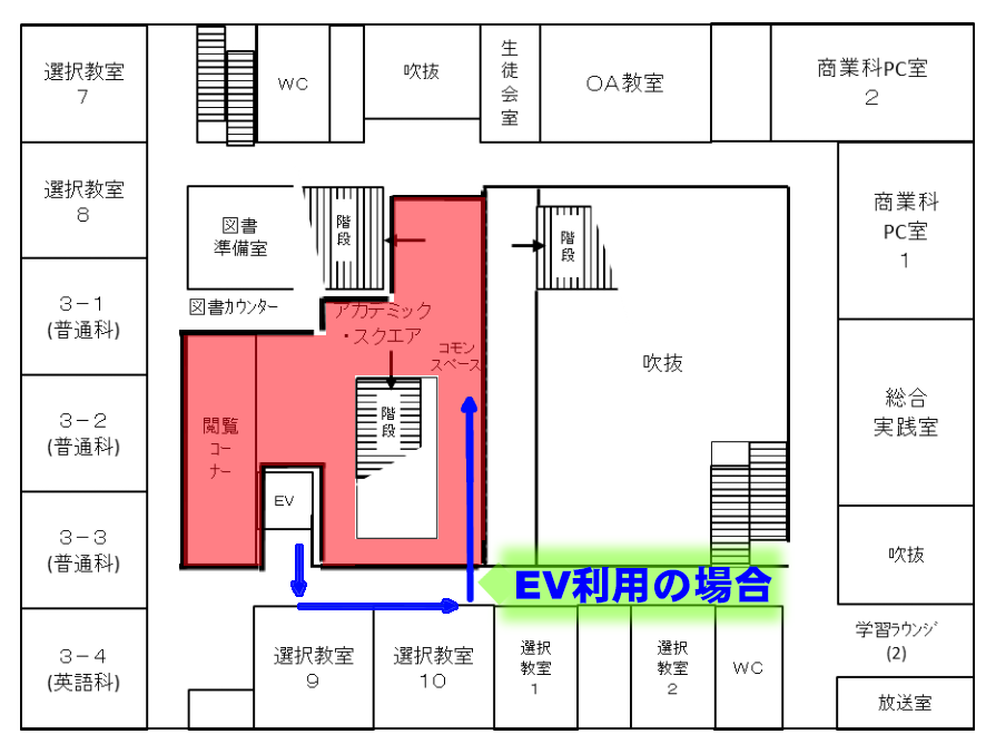 (10) エレベーターの利用は原則禁止とします。ただし、身体上の理由などがある場合は、教職員付き添いの元、利用できるものとします。その際の動線は下記の通りです。