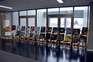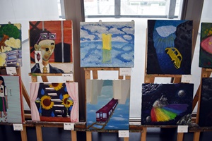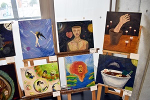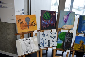 美術の授業選択者の授業中の課題の展示が行われています。