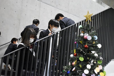 黒階段横のクリスマスツリーには頂上に星が輝きました。