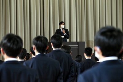 逆瀬川校長からは、新型コロナウイルスの影響下での一年を頑張った生徒を讃えるとともに、