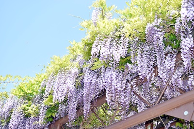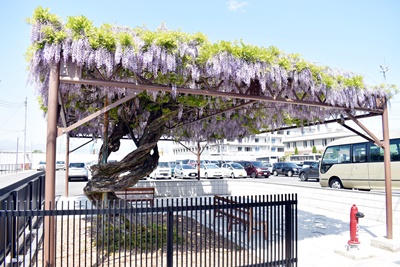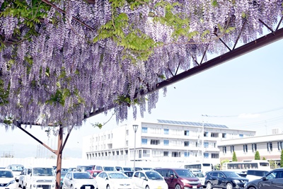 青洲高校の職員駐車場に面した代官所の藤が見頃を迎えています。