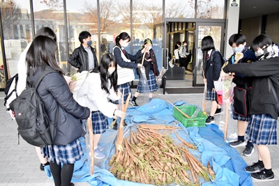 山梨県立青洲高等学校 > 学校生活 > 青洲学 > 市川三郷町役場より大塚ニンジン 2021年11月29日カテゴリー: 青洲学 青洲DIARY 学校生活 市川三郷町役場より大塚ニンジン 青洲学では、地域の地場産業などを学習しています。 1年次生は農協大塚共選所などへの フィールドワークも行っています。 本日は、市川三郷町より収穫したばかりの大塚ニンジンが届き、 生徒への配付を行っていただきました。