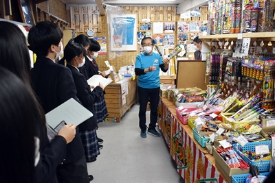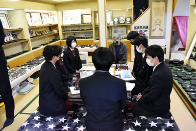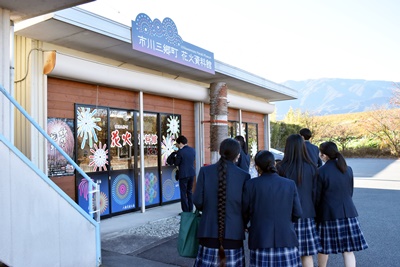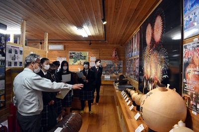 山梨県立青洲高等学校 > 学校生活 > 青洲学 > 12/1 青洲学1年次フィールドワーク 2021年12月1日カテゴリー: 青洲学 青洲DIARY 学校生活 12/1 青洲学1年次フィールドワーク 1年次の青洲学では峡南地域の防災、歴史、地場産業などについて 学科をこえた班を作り、フィールドワークなどを交え 各班で決めた研究テーマに基づき研究を行っています。 本日は、 市川和紙夢工房、楽園ぶどう酒醸造所、花火館、花火資料館 峯硯堂本舗、六郷地場産業会館、市川三郷町役場 以上の事業所でのフィールドワークが行われました。