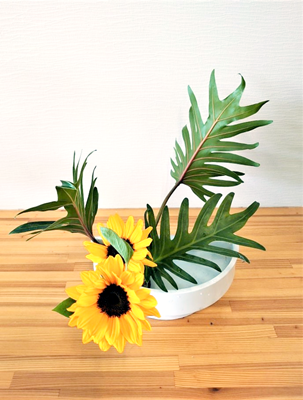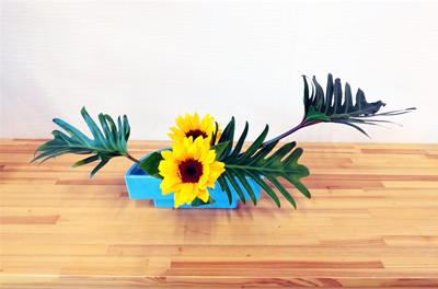 花材は、ひまわりが2本、クッカバラという葉を3本です。