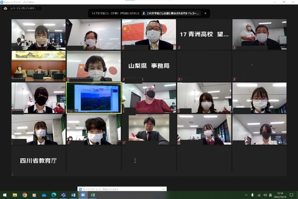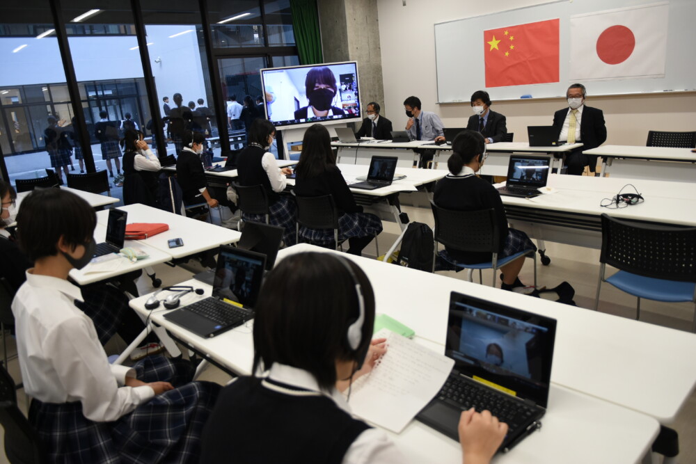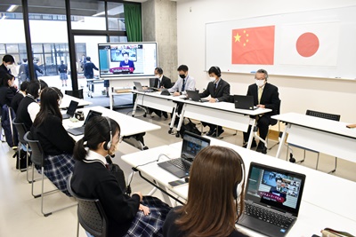 青洲高校と四川省の楽山一中との間でリモート中継を利用し行われました。
