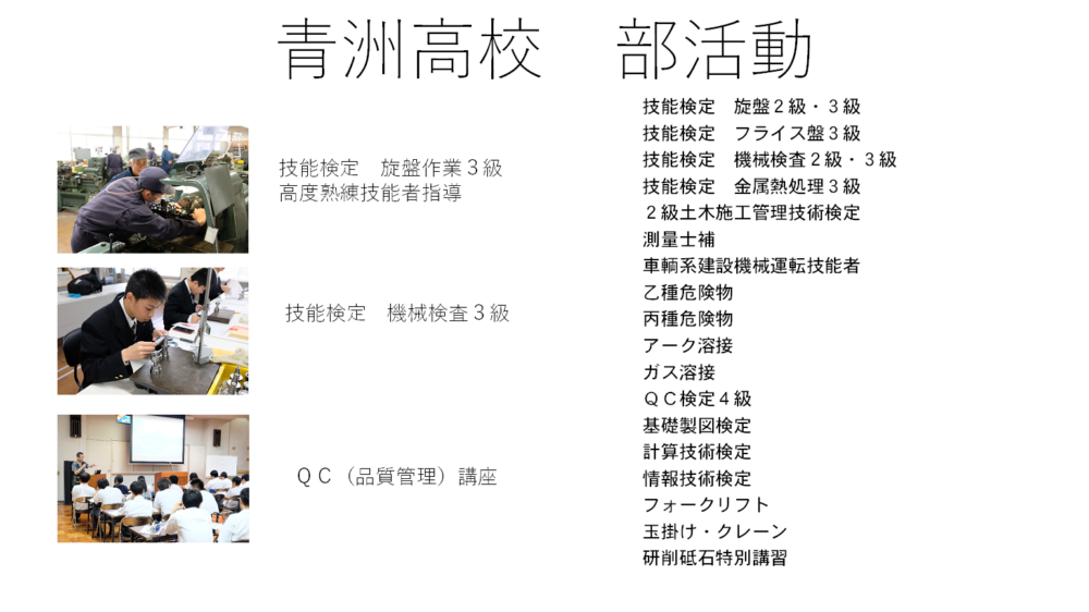 1.工業系の資格取得を目指します。資格の一例としては、溶接、無線、危険物取扱者などです。